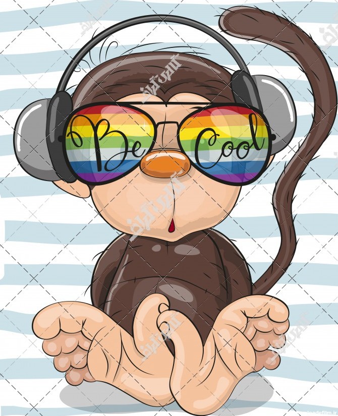 تصویر میمون کارتونی با عینک و هدستدی جی مانکی ، DJ MONKY وکتور میمون بازیگوش در پس زمینه راه راه
