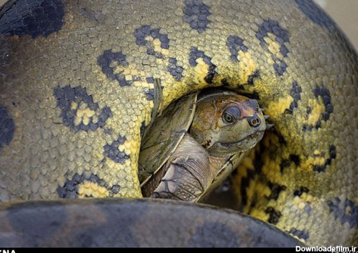 آناکوندای سبز که تا طول 8.8 متری و وزن 227 کیلوگرمی رشد میکند و قطر بدنش گاه به 30 سانتیمتر نیز میرسد، معمولا از خوک، آهوها، پرندگان، سوسمار و حتی پلنگ تغذیه میکند اما این بار نتوانست یک لاکپشت کوچک را ببلعد.