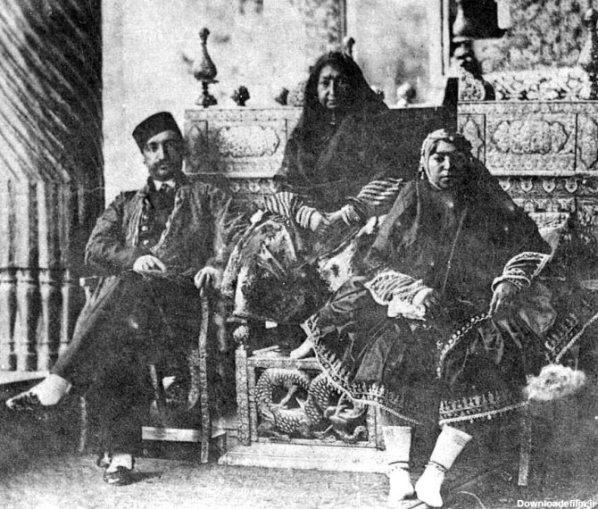 عکسی از ناصرالدین شاه قاجار در کنار مادر و خواهرش را می بینید.