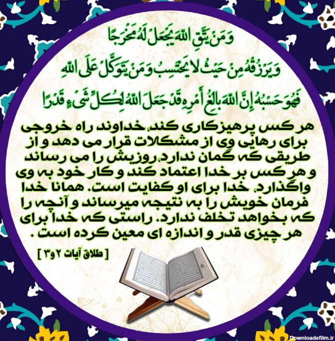 هر کس پرهیزکاری کند،خداوند راه خروجی برای رهایی وی از مشکلات قرار می دهد و از طریقی که گمان ندارد،روزیش را می رساند و هر کس بر خدا توکل کند و کار خود به وی واگذارد،خدا برای او کفایت است.