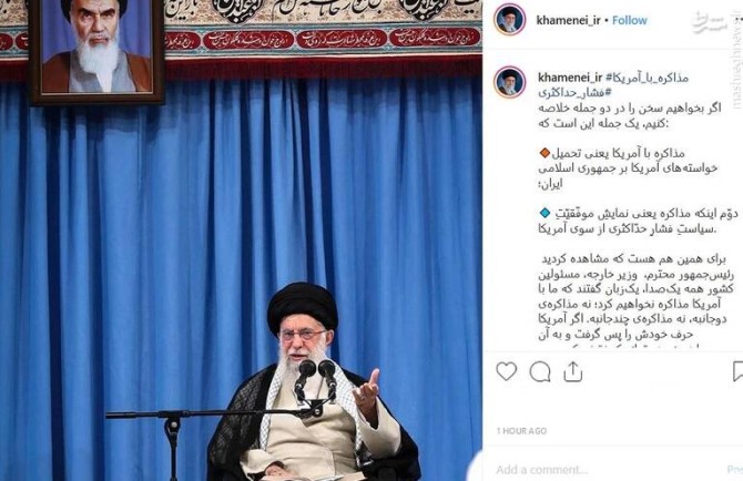 اقتصادنیوز؛ صفحه اینستاگرامی مقام معظم رهبری درباره مذاکره با آمریکا نوشت: اگر بخواهیم سخن را در دو جمله خلاصه کنیم، یک جمله این است که: مذاکره با آمریکا یعنی تحمیل خواستههای آمریکا بر جمهوری اسلامی ایران؛ دوّم اینکه مذاکره یعنی نمایشِ موفّقیّتِ سیاستِ فشارِ حدّاکثری از سوی آمریکا