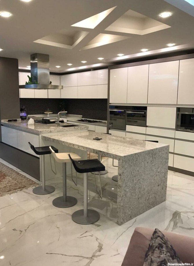 عکس و تصاویر نمونه کار کابینت مدرن های گلاس نقره ای رنگ مدل 2021 . دستگیره مخفی به همراه صفحه کورین فوق العاده شیک به سلیقه مشتری
