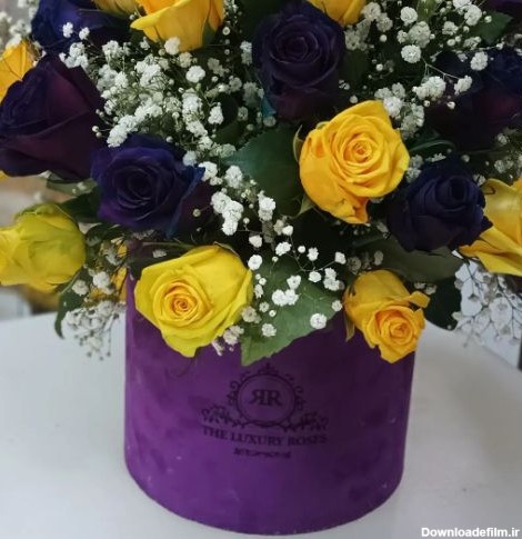 گل رز زرد و بنفش، شاخه های رز هلندی زرد بنفش داخل باکس مخمل هم رنگ گل ها بهترین کادو برای دوست صمیمی دختر و تقدیم آن در رستوران البرز تهران