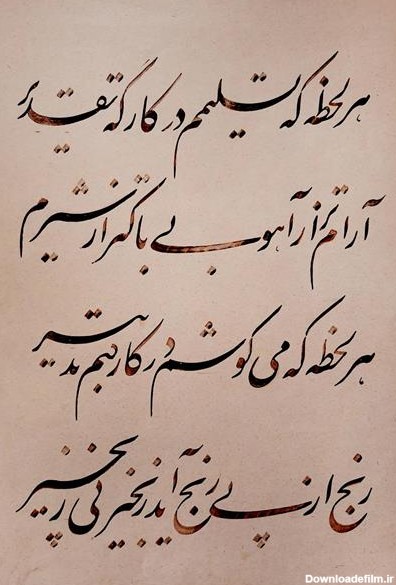 هر لحظه که تسلیمم در کارگه تقدیر آرام تر از آهو بی باک تر از شیرم هرلحظه که می کوشم در کار کنم تدبیر رنج از پی رنج آید زنجیر پی زنجیر اثر خوشنویسی هنرمند اعظم علیزاده نیک - بزرگترین مرجع خرید و فروش عکس و طرح لایه باز با کیفیت بالا در ایران در پارس استاک.