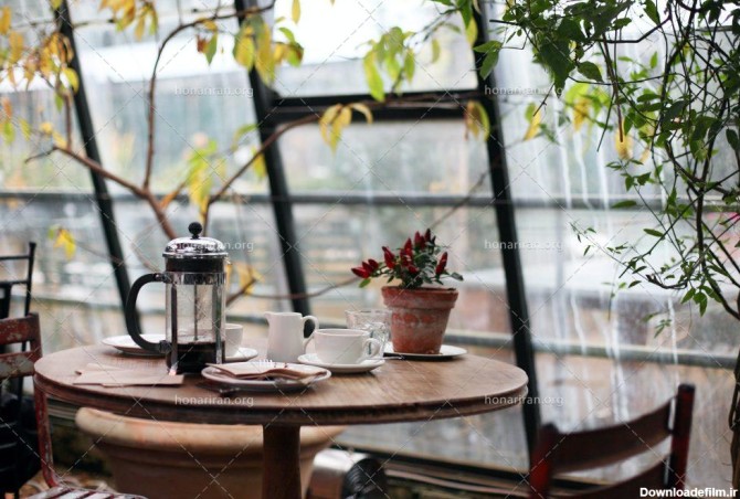 دانلود عکس با کیفیت کافیشاپ زیبا با پنجره های بزرگ و فضای زیبا با شاخه و برگ های سبز + این تصویر مورد استفاده برای: کافی شاپ و فروشگاه قهوه و خوراکی ( غذا و نوشیدنی ) + با رنگ بندی: سبز و مشکی و سفید