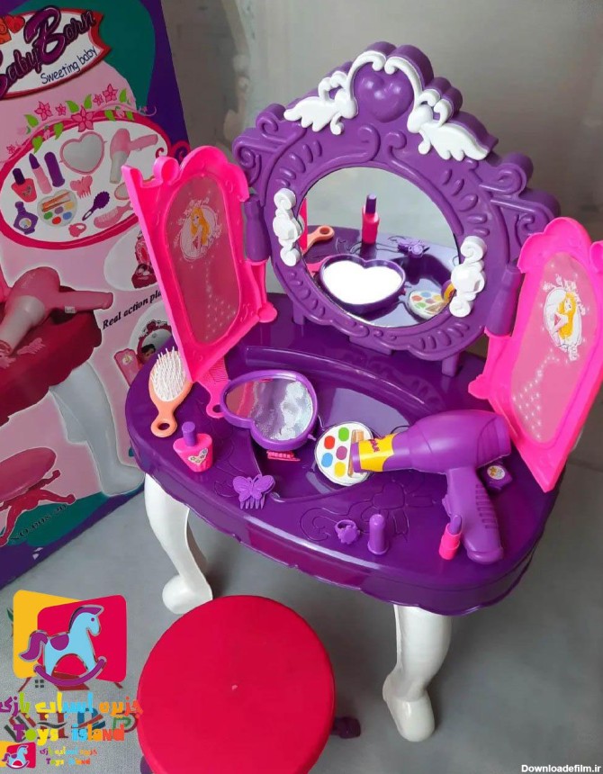 ست میز آرایش موزیکال کودک شامل آینه با درب های بازشو، صندلی، سشوار با قابلیت باد زدن، گردنبند مرواریدی، شانه، رژ لب، ادکلن، و ... است.