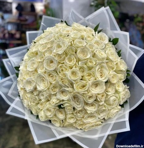 دسته گل بزرگ رز سفید، شاخه های رز هلندی به تعداد بسیار زیاد با کاغذپیچی ضد آب به شکل دایره هدیه برای دوست لاکچری در رستوران مظفریه تهران