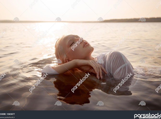 زن زیبا برهنه در آب در غروب آفتاب زن بلوند زیبا با موهای خیس کوتاه و سینه های بزرگ پرتره هنری در دریا - بزرگترین مرجع خرید و فروش عکس و طرح لایه باز با کیفیت بالا در ایران در پارس استاک.