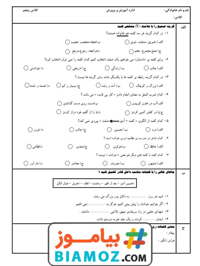 نمونه سوال درس 8 تا 13 فارسی (سری3) — پنجم دبستان