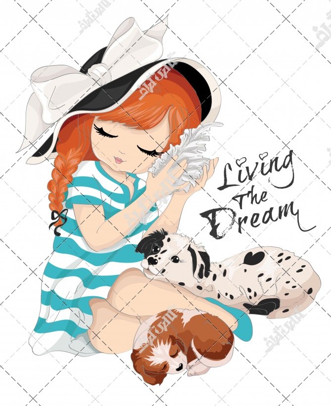 وکتور دختر عروسکی با سگ هایشسگ خانگی ، دختر عروسکی ، دختر بچه کارتونی ، دختربچه عروسکی ، پوستر اتاق خواب کودکان ، سگ خالدار ، کلاه