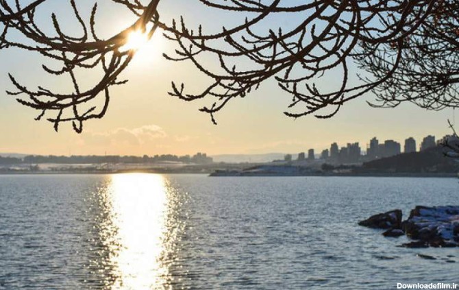 تصویر با کیفیت دریاچه زیبا همراه با منظره زیبای غروب آفتاب و درخت عکس با کیفیت منظره این تصویر قابل چاپ در ابعاد بزرگ می باشد. در این کادر دریا