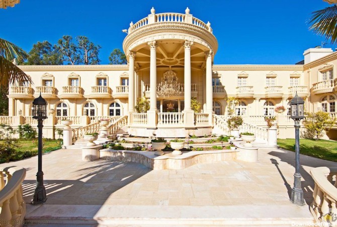 دانلود عکس با کیفیت ویلا با نمای زیبا و استخر بزرگ + این تصویر مورد استفاده برای: مشاور املاک و تجاری و مالی + با رنگ بندی: آبی و سفید و مشکی