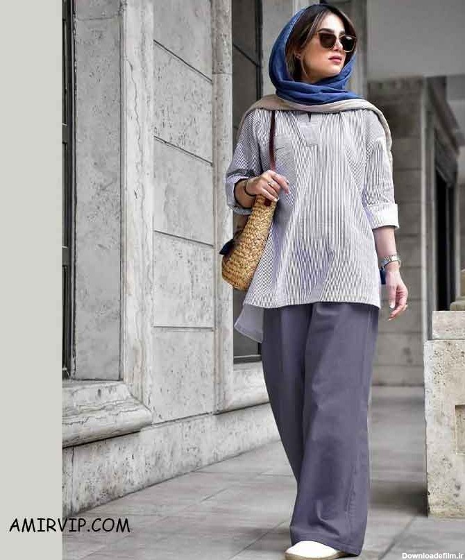آنچه خواهید دید: استایل شلوار بگ با مانتو کوتاه، مدل مانتو کوتاه با شلوار بگ، شلوار بگ پارچه ای با مانتو کوتاه، شلوار بگ جین با مانتو کوتاه کتی در AmirVIP