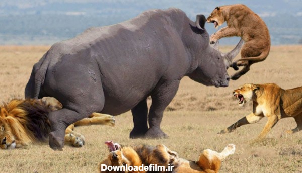 کرگدن باردار که در گودالی گرفتار شده بود با دیدن شیر هایی که منتظر حمله به او بودند آخرین توانش را برای زنده ماندن به کار بست.