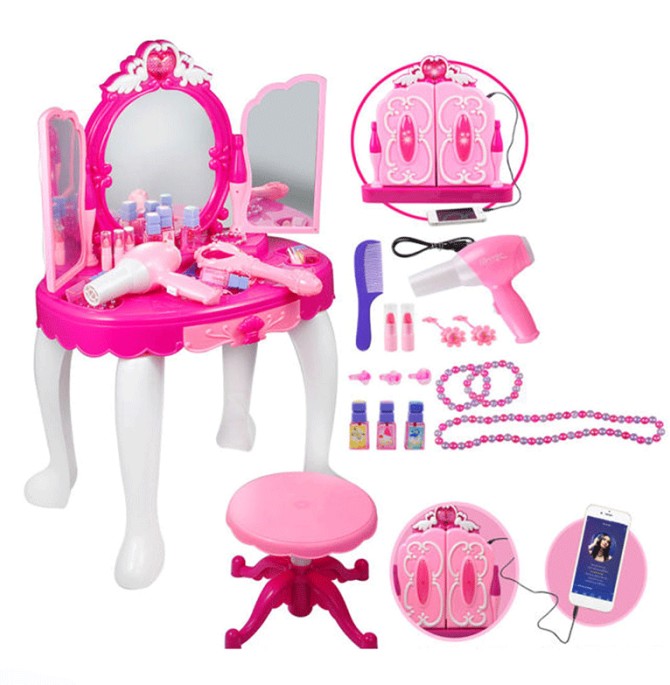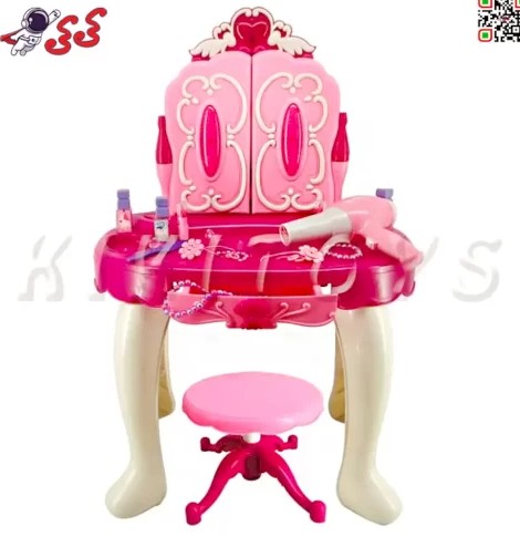 میز آرایش بچگانه چوبی مناسب منزل و خانه بازی و مهدکودک میباشد و صورتی رنگ بوده و به همراه خود یک صندلی نیز دارد.