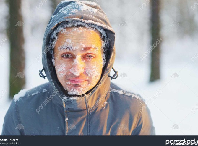 مرد جوان یخ زده در یک ژاکت با کلاه با برف در جنگل زمستانی پوشیده شده است برف بر روی مژه ابرو گونه ها قرار می گیرد - بزرگترین مرجع خرید و فروش عکس و طرح لایه باز با کیفیت بالا در ایران در پارس استاک.