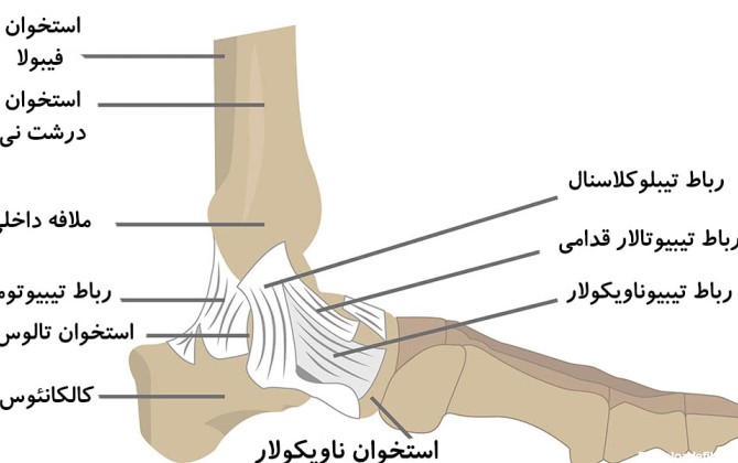 مچ پا از کنار هم قرار گرفتن چهار استخوان تشکیل شده است. در بالا استخوان های درشت نی (تیبیا) و نازک نی (فیبولا) قرار گرفته اند