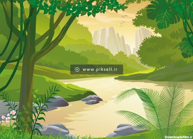 فایل لایه باز بکگراند گرافیکی طبیعت ، رودخانه و جنگل . ارائه شده با دو پسوند eps و ai