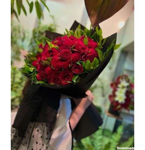 شاخه گل رز تزیین، شش شاخه رز هلندی قرمز با پامپاس و کاغذپیچی مشکی، این دسته گل ساده کادو برای دختر محجبه و تقدیم به او در رستوران دینارو تهران