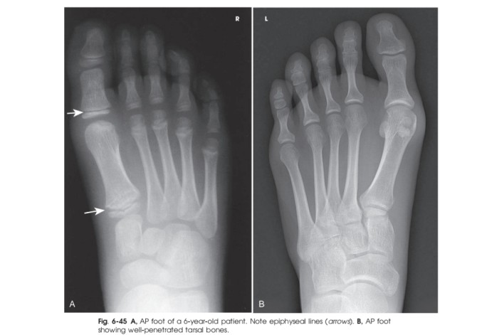 رادیوگرافی ها ممکن است با اشعه مرکزی عمود بر صفحه IR یا زاویه دهی 10 درجه به سمت خلف ( به سمت پاشنه ) بدست آید . زمانی که زاویه ی 10 درجه به سمت خلف استفاده می شود ، اشعه مرکزی عمود بر متاتارس ها و کوتاه شدگی کاهش می یابد .همچنین فضای مفصل TMT در ناحیه ی میانی کف پا بهتر نشان داده می شوند . ( تصاویر 6-39,6-40)