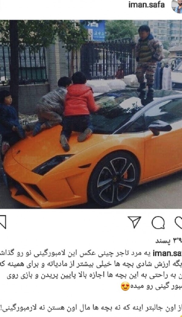 یه مرد تاجر چینی عکس این لامبورگینی نو رو گذاشته تا بگه ارزش شادی بچه ها خیلی بیشتر از مادیاته و برای همینه که اون به راحتی به این بچه ها اجازه بالا پایین پریدن و بازی روی لامبور گینی رو میده و از اون جالبتر اینه که نه بچه ها مال اون هستن نه لارمبورگینی! '