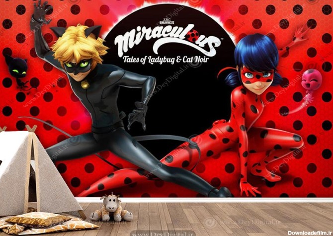 طرح سه بعدی دختر کفشدوزکی لیدی باگ و گربه سیاه با زمینه قرمز خال خالی قرمز و مشکی