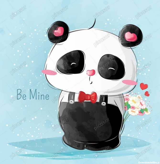 وکتور پاندا کوچولو پسر با دسته گل نقاشی آبرنگی - وکتور تصویرسازی کودکانه از بچه خرس پاندا با لباس مردانه وکتور پاندا وکتور نقاشی بچه پاندا پسر وکتور نقاشی