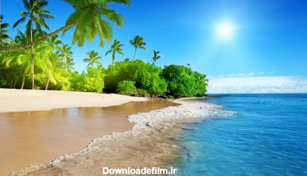 منظره ساحل زیبای جزیره ، عکس بسیار زیبا از سواحل آرامش بخش جزیره با درختان نخل و امواج آرام روی شنهای ساحل، تصویر موجهای آرام در سواحل شنی جزیره و آسمان آبی و آفتابی، زیباترین عکس ها از طبیعت ساحل و دریا