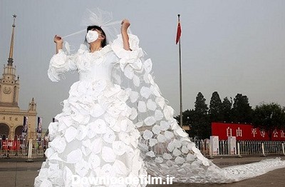 یک هنرمند چینی در پکن با دوخت لباس عروسی متفاوت نظرها را به سمت خود جلب کرده است. لباس مذکور با صدها ماسک صورت( مخصوص مقابه با آلودگی هوا) ساخته شده است.آلودگی هوای شهرهای بزرگ چین مشکلات بسیاری را برای شهروندان ایجاد کرده است.