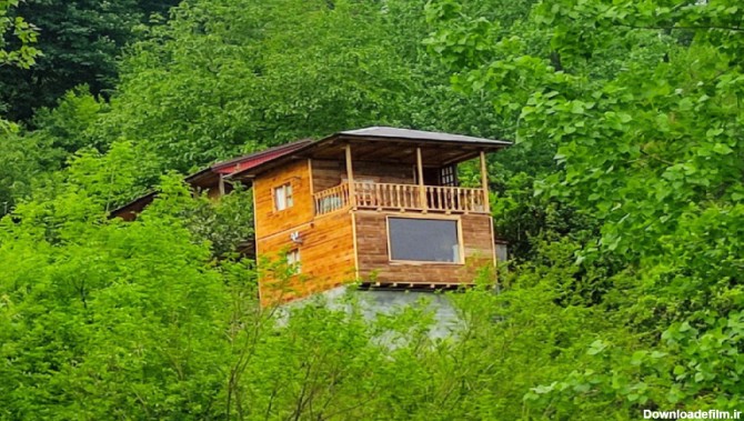 کلبه جنگلی چوبی در دل جنگل در کنار اب بندانی زیبا