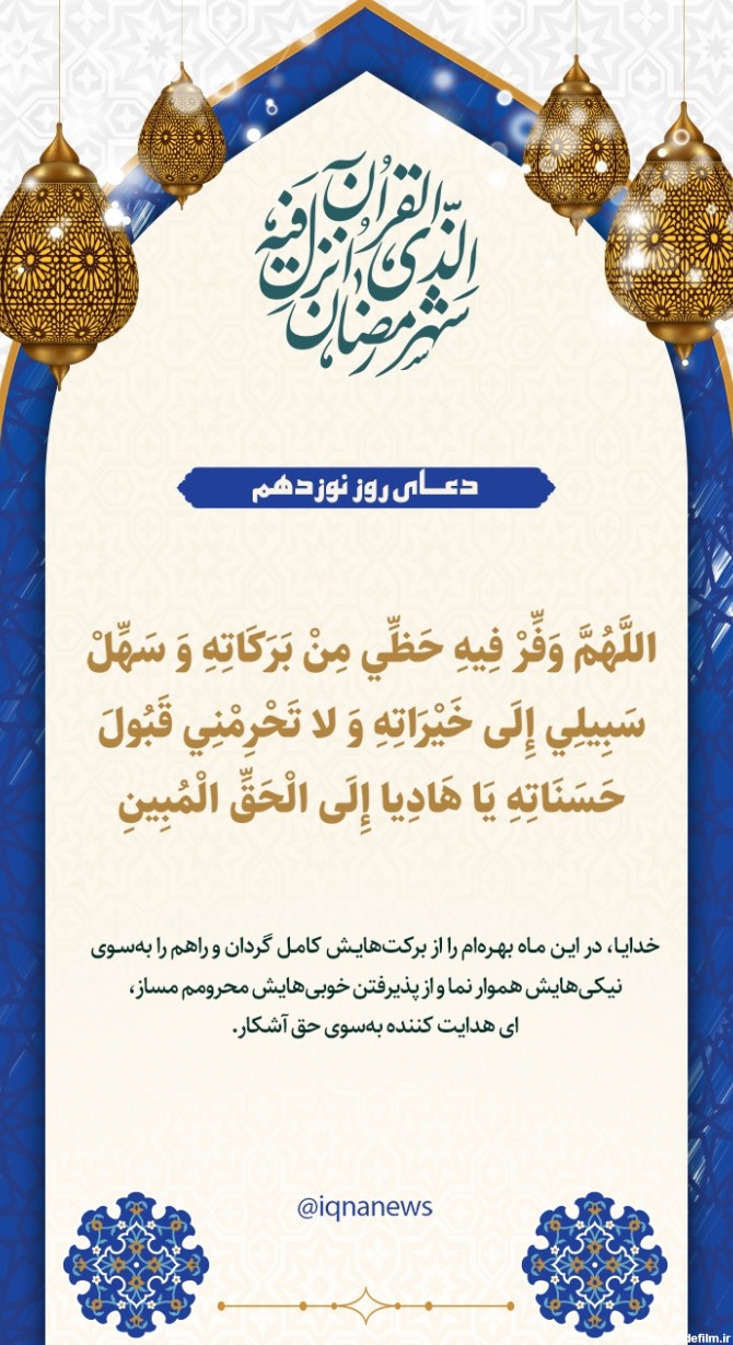 اللّٰهُمَّ وَفِّرْ فِيهِ حَظِّى مِنْ بَرَكاتِهِ، وَسَهِّلْ سَبِيلِى إِلىٰ خَيْراتِهِ، وَلَا تَحْرِمْنِى قَبُولَ حَسَناتِهِ، يَا هادِياً إِلَى الْحَقِّ الْمُبِينِ. خدایا، در این ماه بهرهام را از برکتهایش کامل گردان و راهم را بهسوی نیکیهایش هموار نما و از پذیرفتن خوبیهایش محرومم مساز، ای هدایت کننده بهسوی حق آشکار.