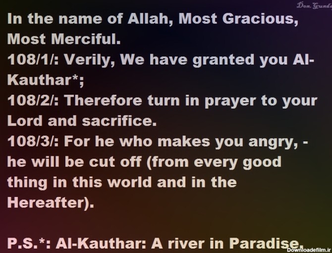 "سوره کوثر به زبان انگلیسی ایجاد شده توسط کاربر aassmaa در دسته بندی گوناگون با 13 لایک و با 1 نظر ثبت شده در ویسگون بزرگترین شبکه اجتماعی عکس و فیلم ایرانی"