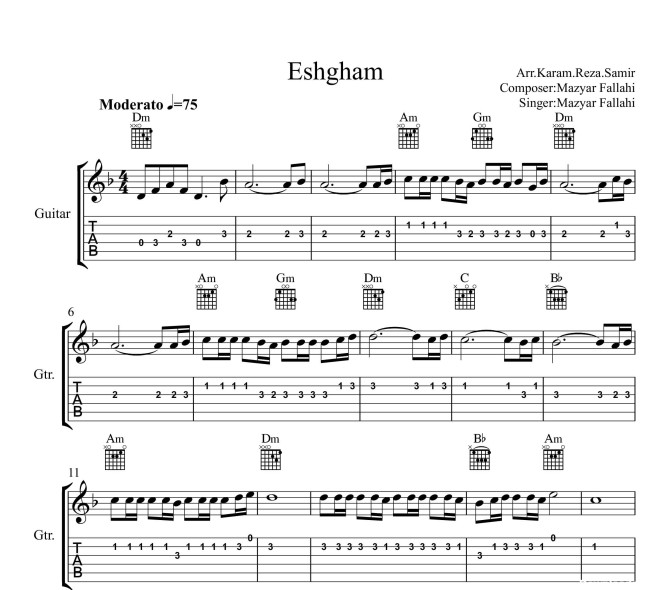 نت گیتار عشقم از مازیار فلاحی بهمراه تبلچر و آکورد
