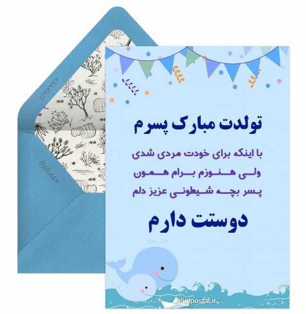 کارت پستال تولدت مبارک پسرم با اینکه برای خودت مردی شدی ولی هنوزم برام همون پسر بچه شیطونی عزیز دلم دوستت دارم, تولد پسرم - پارسا زارع, کارت پستال متن تبریک تولد پسر - کارت پستال دیجیتال