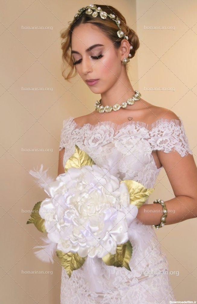 دانلود عکس با کیفیت عروس زیبا با تاج طلایی با دسته و لباس عروس سفید زیبا + این تصویر مورد استفاده برای: کسب و کار/ مهارت و مزون عروس + با رنگ بندی: سفید و طلایی