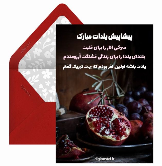 کارت پستال پیشاپیش یلدات مبارک سرخی انار را برای قلبت بلندای یلدا را برای زندگی قشنگت آرزومندم یادت باشه اولین نفر بودم که بهت تبریک گفتم, یلدا - کلمست, کارت پستال پیشاپیش یلدات مبارک - کارت پستال دیجیتال