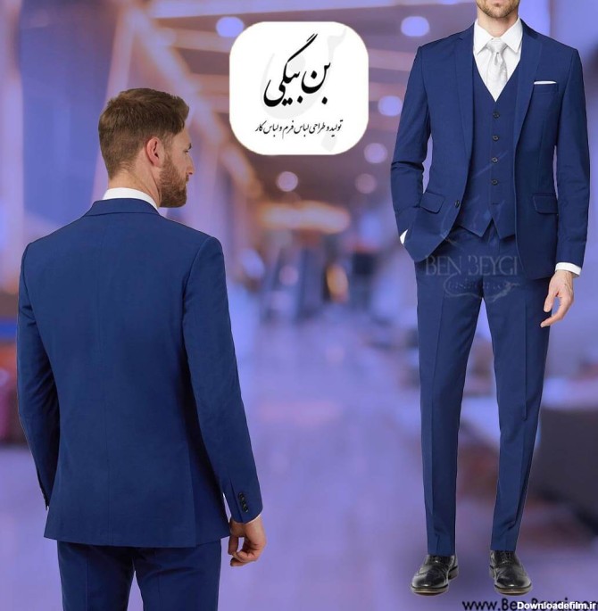 کت شلوار مردانه اداری پارچه فاستونی رنگ سرمه ای یقه انگلیسی دو دکمه دو چاک کد 16867 از برند بن بیگی با خدمات سایزگیری و پرو در محل