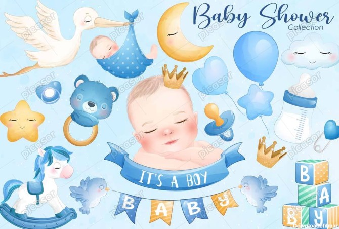 مجموعه وکتور نوزاد پسر و سیسمونی با اسباب بازی و پستانک - وکتور تصویرسازی کودکانه از نوزاد پسر و لک لک وکتور بچه پسر وکتور پستانک وکتور اسباب بازی پسرانه