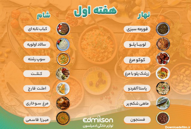 برای ناهار یا شام چی بپزم؟ 130 نوع غذای مختلف در جدول لیست غذاهای ایرانی آورده شده است. این برنامه غذایی را به صورت هفتگی استفاده کنید