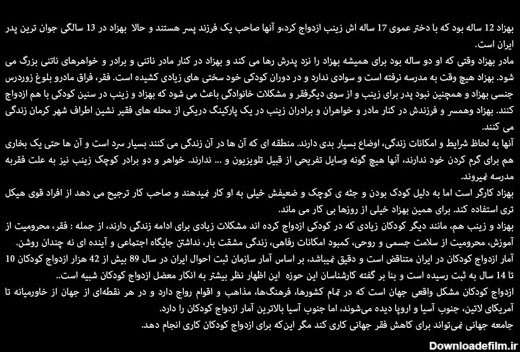 بهزاد 12 ساله بود که با دختر عموی 17 ساله اش زینب ازدواج کرد،و آنها صاحب یک فرزند پسر هستند و حالا بهزاد در 13 سالگی جوان ترین پدر ایران است.