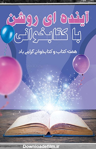 بنر روز کتاب و کتابخوانی طرح PSD لایه باز با عکس کتاب و نور جادویی و متن آینده ای روشن با کتابخوانی و تبریک هفته کتاب و کتابخوانی طراحی شده در فتوشاپ