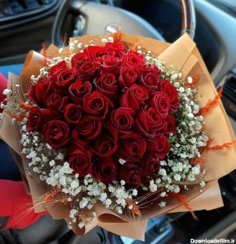 دسته گل رز قرمز خواستگاری، شاخه های رز هلندی قرمز ژیپسوفیلا با کاغذپیچی کرافت هدیه خاص ولنتاین برای خانم ها در رستوران ورسای تهران