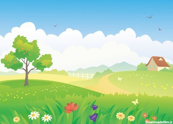 دانلود فایل لایه باز وکتوری پس زمینه کارتونی از طبیعت شامل گل ، آسمان و خورشید