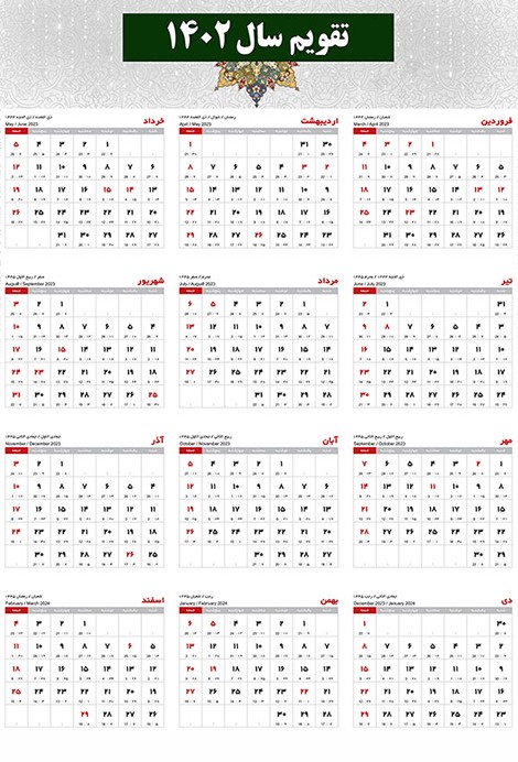تقویم 1402 در یک نگاه + جدول تقویم 1402. مشاهده تمامی مناسبتهای رسمی سال 1402 مصوب شورای فرهنگ عمومی به همراه تعطیلات رسمی