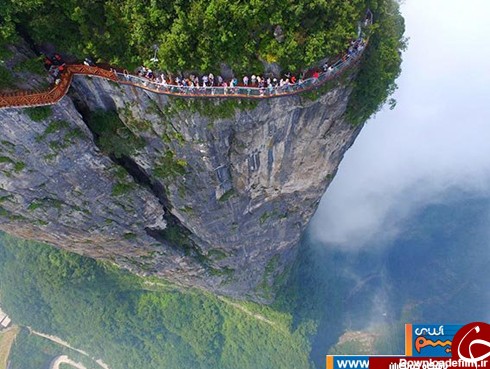 در این مطلب، تصویری از رفت و آمد گردشگران از مسیر هراس انگیز ساخته شده روی صخره در