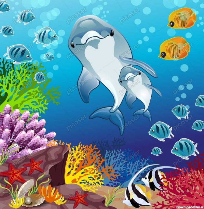 وکتور تصویر سازی کارتونی دنیای زیر آب و حیوانات وکتور دلفین و حیوانات دریایی وکتور پس زمینه دریا وکتور پس زمینه زیر آب وکتور پس زمینه کف اقیانوس پس زمینه زیر