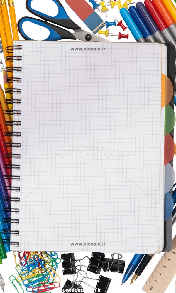 عکس با کیفیت دفتر نقاشی با لوازم التحریر ماژیک و مداد رنگی و قیچی و پاکن و گیره کاغذ و طراحی فانتزی ویژه کلاس های نقاشی و فروشگاه های لوازم التحریر