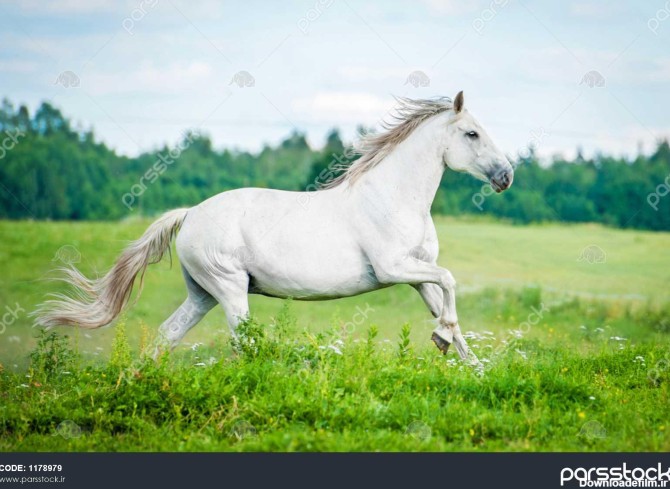 اسب سفید زیبا که در زمین تابستانی می دود - بزرگترین مرجع خرید و فروش عکس و طرح لایه باز با کیفیت بالا در ایران در پارس استاک.