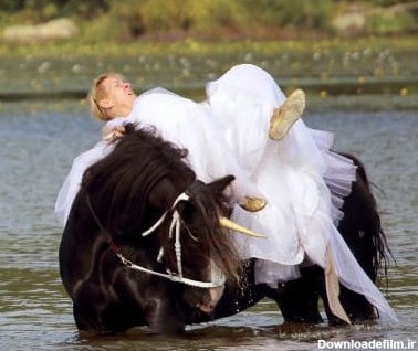 دختری که برای روز عروسی اش با لباس عروس به همراه اسبش وارد یک دریاچه شد, به داخل آب سقوط کرد!