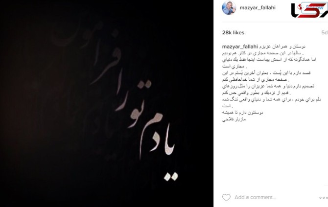 رکنا: مازیار فلاحی در اینستاگرام خود از خداحافظیاش با دنیای مجازی خبر داد